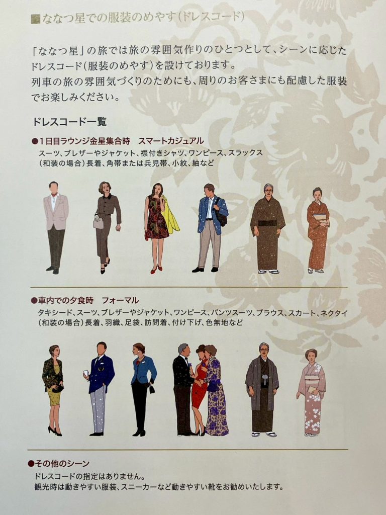 ななつ星ではディナータイムやバー(KAZ BAR)利用の際はドレスコード(フォーマル)、ラウンジ金星の集合時はカジュアルフォーマルが求められます。我々もここが最も悩んだポイントでした。